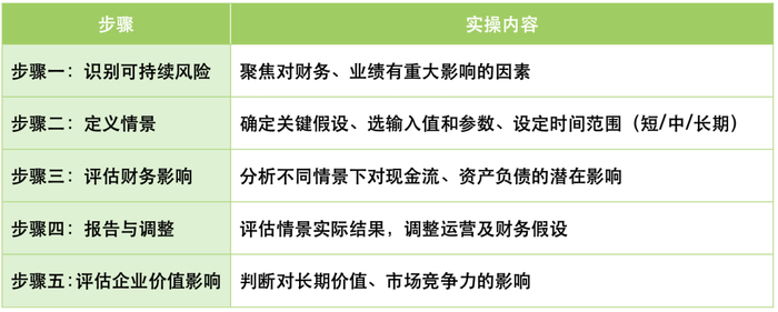 情景分析是企业评估可持续风险韧性的核心工具,表格梳理了情景分析的关键步骤与行动要点,帮助企业预判潜在影响、制定应对策略,增强风险抵御能力。