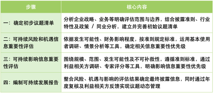 重要性评估是识别、判断和披露可持续风险、机遇和影响的核心流程,表格列出了评估的四个关键步骤及内容,为企业开展信息披露提供系统性指导。